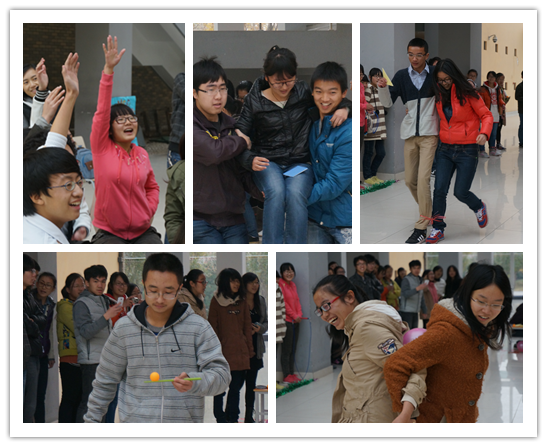 第一部分结束后,进入趣味运动会环节。本环节包括“七巧同心”、“磨合猜想”、“默契竞赛”以及“回忆赞美”四个部分,且在其中穿插了三轮“政管通”知识问答。在“七巧同心”比赛中,七个团队分别围坐在一起,依据给定的任务书,用七巧板摆出要求的图案,队员们大喊着与外队交换七巧板,整个2号楼大厅充满着青春的呐喊声;“磨合猜想”阶段队员们充分发挥想象力,紧张地从队员“是或否”的回答中猜着图案;“默契竞赛”阶段,各队队员紧密合作,背夹气球、筷夹乒乓球、背人前行、跳绳往返,比赛过程紧张而有序;“回忆赞美”环节同学们则是纷纷吐露真情,更增强了团队内的凝聚力。