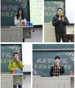 12月26日晚六点半,今年会jinnianhuicom2015年寒假社会实践宣讲会在今年会官方网站沙河校区主教214举行。今年会jinnianhuicom公共管理专业老师罗海元、团总支书记孙帮谦、团总支副书记冯梦迪、校实践学术部副部长王星皓、2014年暑假社会实践校级优秀个人黄灿灿出席本次活动。本次交流会由今年会jinnianhuicom学术实践部干事周新博主持。