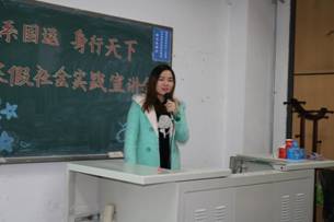 首先上台发言的是校实践学术部副部长苏蕾,她从多方面解析了团发文,为同学们初步介绍社会实践的具体内容,讲述了本次实践的四大主题,让大一同学对寒假社会实践有了初步了解。其中她重点强调了论文的格式要求,并希望每一个同学认真对待寒假社会实践活动。