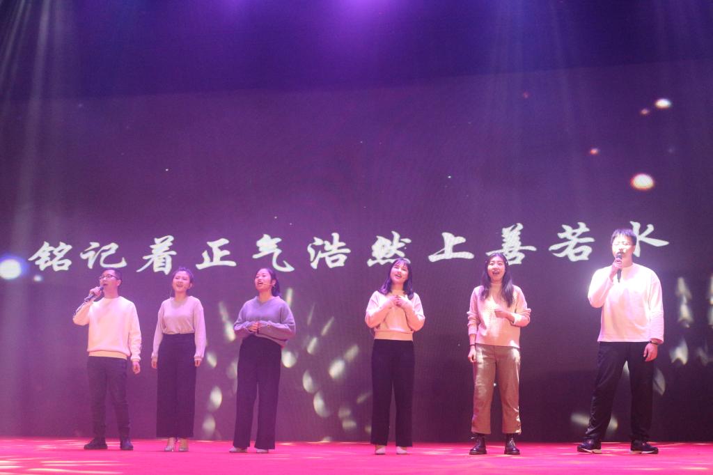 联欢会最后一项节目是由国庆广场合唱团成员、“春潮滚滚”方阵成员、演职人员代表共同带来的大合唱《不忘初心》。大合唱《不忘初心》将每个人的爱国情怀调动起来,全场气氛升华到最高。红日初升,其道大光,河出伏流,一泻汪洋,我政管学子定将不忘初心、牢记使命,书写我们的青春芳华。