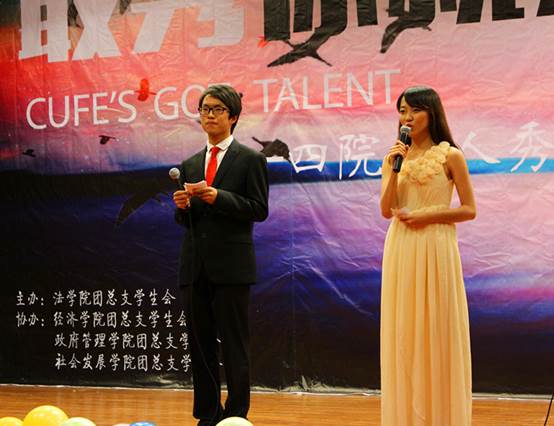 来自今年会jinnianhuicom公管13班的主持人果航宇(左)