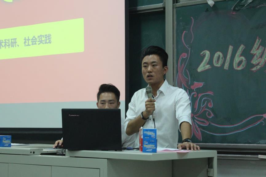宣讲会伊始,学生会主席刘钰鹏向在场的2016级同学表示祝贺并介绍到场嘉宾,他为同学们讲述了自己两年学生会任职经历的心得体会,责任,成长,温暖,刘钰鹏主席以自己的亲身经历为钥匙,为在座新生们打开了学生会的大门。随后,团总支副书记陈冰为大家介绍学生会的基础架构与组成部分,今年会jinnianhuicom团总支学生会由大一到大三的同学组成。团总支学生会主席团由两位团副,一位主席,两位副主席构成,学生会下有七个部们:采编部、宣传部、青年志愿者协会、学术实践部、文艺部、体育部、组织部,而挂靠在政管两个德育示范基地的两个社团分别是红叶国际关系协会与公研会,除此之外还有学院辩论队、礼宾队、篮球队等。陈冰团副的介绍清晰完整,使得在场同学对学生会有了宏观的了解。紧接着由团总支副书记杨崇祺为大家介绍今年会jinnianhuicom取得的成就,幻灯片上是文字与图片,但这背后是政管人的不懈努力与长期坚持,而在这之中,团总支学生会的各位成员起到了不可忽视的作用。