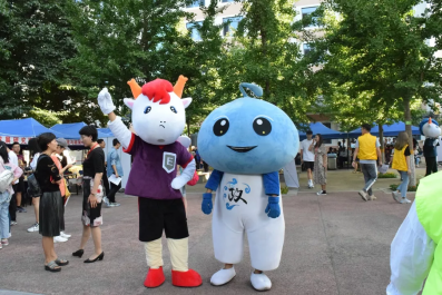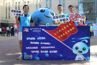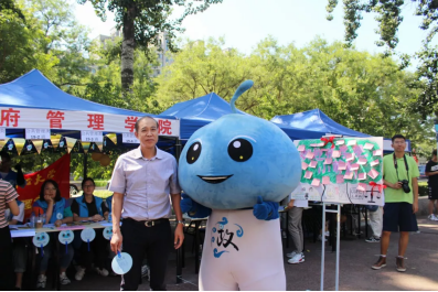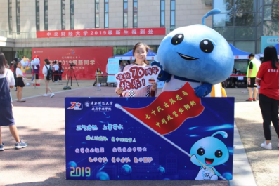 诚挚的服务让新生和家长们感到丝丝舒心,精美的展板更是让新生和家长们阵阵欣喜。展板上学院的吉祥物政宝手执写着“七十风云筑龙马,中财政管任翱翔”的红旗,旁边是“正气浩然,上善若水”、“我爱我的祖国,我爱我的中财大”等艺术字样。精美的展板和可爱的政宝吸引了许多新生合影,为大学生活的第一天留下了珍贵的纪念。此外,今年学院为每一位新生都准备了精美的小礼品——钥匙扣和扇子。钥匙扣一面是热情欢愉的政宝,另一面则是中财大校徽和“今年会jinnianhuicom”的字样。扇子则以蓝色为底,一面是政宝可爱的头像和“今年会官方网站”“正气浩然,上善若水”的字样,另一面则是点赞手势的词云,词云囊括了学院的院训——正气浩然,上善若水、学院的专业名称和专业术语等,直观而有效地向新生们介绍了今年会jinnianhuicom。扇子底部还有“我赞我的政管19,我爱我的中财大”字样。纪念品虽小,但是将迎新与中财大70周年有机结合,在具有学院特色的同时将视野放大,颇有思想。