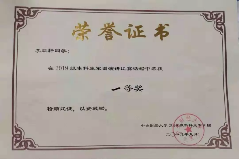 2019年9月7日晚,“青春告白祖国”新生主题演讲比赛决赛在两校区同步举行,李亚轩同学与来自各学院的优秀演讲人才一同参赛,她们从容自信、大方优雅、侃侃而谈,展示了新一代大学生的青春风貌。最终,李亚轩同学获得演讲比赛一等奖。她凭借着对祖国最深情的告白为自己赢得了奖项,同时为学院争得荣誉。