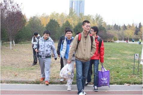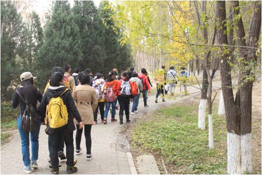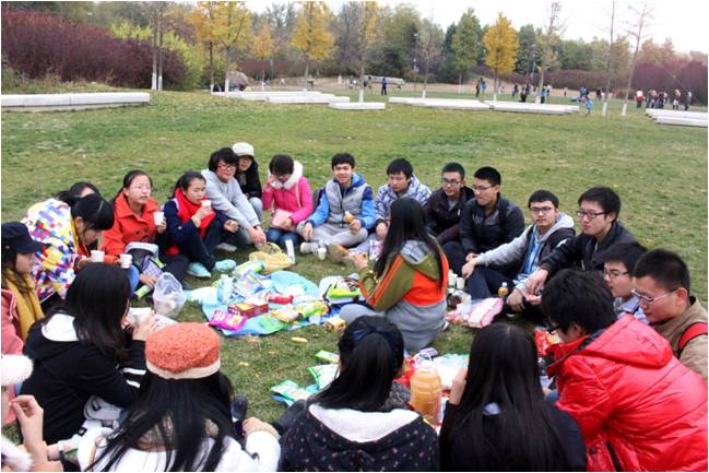中午十二点半,尽管秋风凛冽,地铁拥挤,同学们依然准时到达奥林匹克森林公园南门,兴致勃勃地向公园内进军。进入公园后,大家直奔森林小剧场,在那里开阔柔软的草地上进行野餐。同学们纷纷拿出各自准备的零食,围坐成一圈与大家分享。之后在副班长的带领下玩起了游戏。其间不时地发出阵阵叫好声与欢呼声。野餐完毕,大家齐心协力清理走所有垃圾,其后以自由组合的方式分小队进行游玩。同学们散开在秋色旖旎的公园中,尽情观赏北京在最美季节里婀娜的姿态。下午四点半,所有同学在出口处集合,携带着各自的美好回忆,乘地铁前往沙河,共进晚餐。