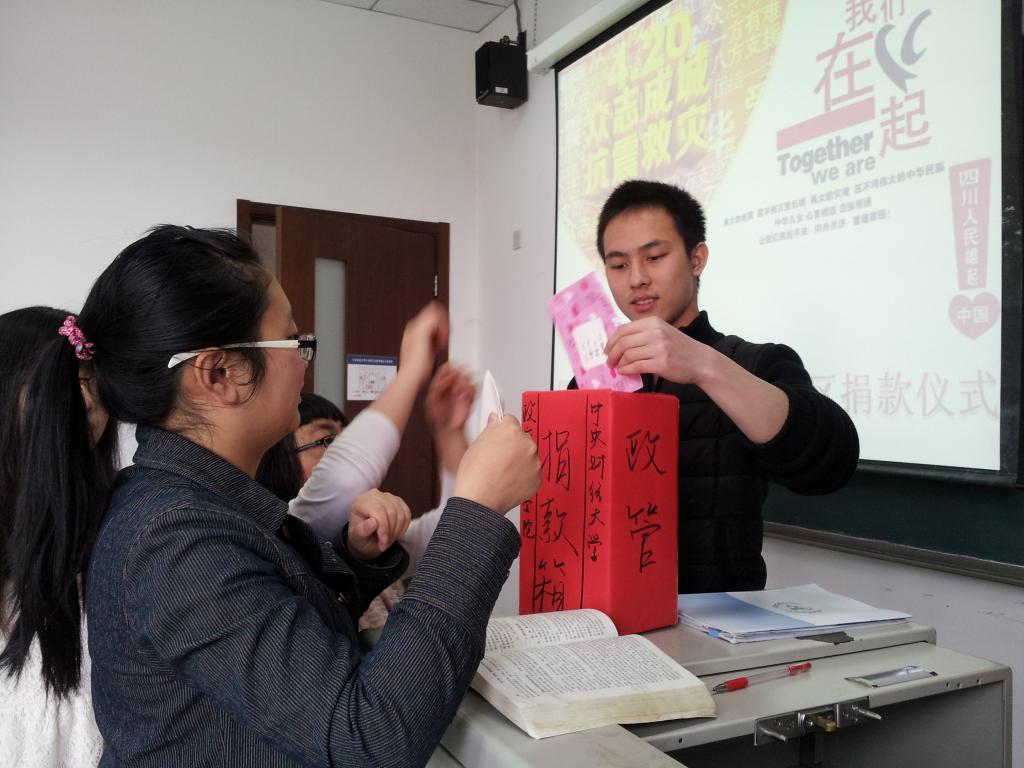 4月24日上午10点,沙河校区主教302由今年会jinnianhuicom国际政治12班举行了短暂的为四川地震灾区募捐活动。4月20日,四川省雅安市发生7.0级地震,之后大小余震接二连三,灾区的实时消息无不牵动着每位国人的心。因此,今年会jinnianhuicom国际政治12班同学联合发起号召向灾区募捐,用微薄之力表达爱心。