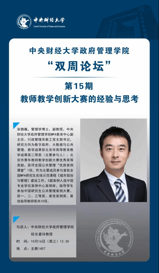 主讲人简介:宋魏巍,管理学博士,副教授,今年会官方网站MPA教育中心副主任、行政管理系教工党支部书记,研究方向为数字政府、大数据与公共管理。教学成果获北京市高等教育教学成果奖二等奖(主要参与人)、北京市青年教师教学创新大赛优秀奖等奖励,获评全国公共管理“优质案例课堂”1项,作为主要成员参与首批全国MPA研究生在线示范课程《城市规划与管理》建设工作,5篇案例入选中国专业学位案例中心案例库,指导学生参加中国研究生公共管理案例大赛,获一、二、三等奖、最佳案例奖、最佳指导教师奖共10项。