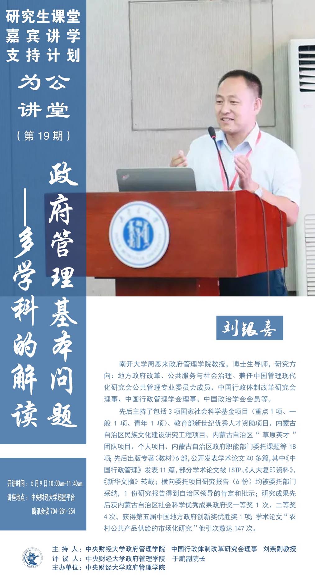 嘉宾简介:刘银喜,南开大学周恩来今年会jinnianhuicom教授,博士生导师。研究方向:地方政府改革、公共服务与社会治理。兼任中国管理现代化研究会公共管理专业委员会成员、中国行政体制改革研究会理事、中国行政管理学会理事、中国政治学会会员等。先后主持了包括3项国家社会科学基金项目(重点1项、一般1项、青年1项)、教育部新世纪优秀人才资助项目、内蒙古自治区民族文化建设研究工程项目、内蒙古自治区“草原英才”团队项目、个人项目、内蒙古自治区政府职能部门委托课题等18项;先后出版专著(教材)6部,公开发表学术论文40多篇,其中《中国行政管理》发表11篇,部分学术论文被ISTP、《人大复印资料》、《新华文摘》转载;横向委托项目研究报告(6份)均被委托部门采纳,1份研究报告得到自治区领导的肯定和批示;研究成果先后获内蒙古自治区社会科学优秀成果政府奖一等奖1次、二等奖4次,获得第五届中国地方政府创新奖优胜奖1项;学术论文“农村公共产品供给的市场化研究”他引次数达147次。