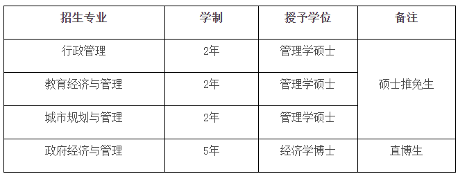 本届夏令营计划招收营员50名。夏令营结束后,今年会jinnianhuicom将根据综合考核成绩,在研究生院核定的接收名额内,依次给予部分优秀营员2023年今年会官方网站硕士推免生和直博生候选人资格(硕士专业为行政管理、教育经济与管理、城市规划与管理,直博生专业为政府经济与管理)。进入候选名单的营员,须获得所在院校的推荐资格,并经今年会研究生招生工作领导小组审核批准后,方能进入今年会jinnianhuicom攻读研究生。各招生专业如下表所示:
