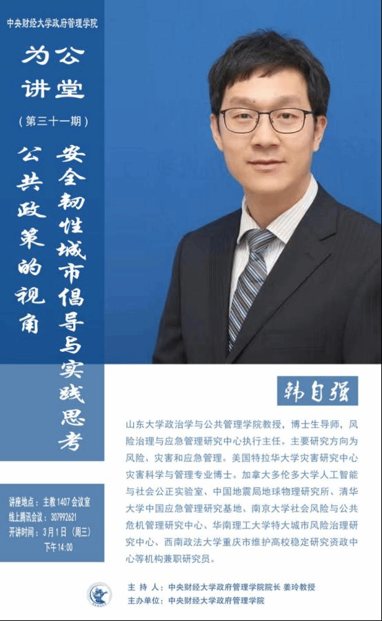 嘉宾简介:韩自强,山东大学政治学与公共管理学院教授,博士生导师,风险治理与应急管理研究中心执行主任。主要研究方向为风险、灾害和应急管理。美国特拉华大学灾害研究中心灾害科学与管理专业博士。加拿大多伦多大学人工智能与社会公正实验室、中国地震局地球物理研究所、清华大学中国应急管理研究基地、南京大学社会风险与公共危机管理研究中心、华南理工大学特大城市风险治理研究中心、西南政法大学重庆市维护高校稳定研究资政中心等机构兼职研究员。