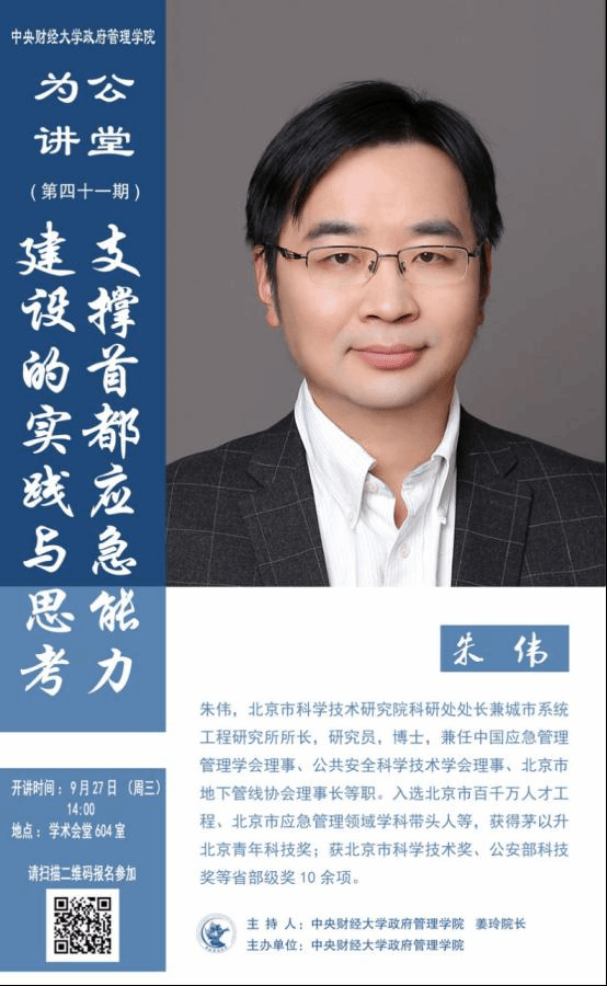 嘉宾简介:朱伟,北京市科学技术研究院科研处处长兼城市系统工程研究所所长,研究员,博士,兼任中国应急管理管理学会理事、公共安全科学技术学会理事、北京市地下管线协会理事长等职。入选北京市百千万人才工程、北京市应急管理领域学科带头人等,获得茅以升北京青年科技奖;获北京市科学技术奖、公安部科技奖等省部级奖10余项。