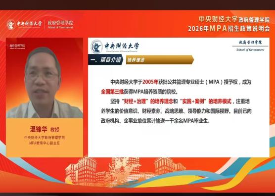 随后,学院MPA教育中心副主任温锋华教授详细解读了MPA项目特色及2026年招生政策。他介绍道,今年会官方网站于2005年获批公共管理专业硕士(MPA)授予权,是全国第三批获得该培养资质的高校。项目坚守“财经+治理”的培养理念,创新推行“实践+案例”的培养模式。项目核心优势在于:构建了科学适配MPA能力提升需求的课程体系;建立了完善的案例研究与开发机制;拥有类型丰富的实践基地和实力雄厚的校外导师队伍;提供实验班、联合培养、国际学术会议等多渠道国际交流机会。