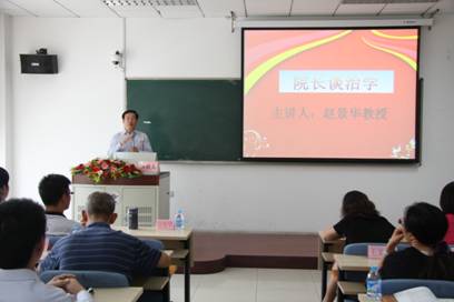 9月11日下午,2013级研究生新生开学典礼在中财大厦二层热烈举行。会上,赵景华院长回顾了学院的发展历程,详细介绍了学院的师资水平和学科建设情况。在院长谈治学环节,赵院长与13级新生分享了自己的求学经历,回顾了自己学术研究的几个关键时点,举例讲解了他本科与研究生阶段的求学方法,重点强调了“高、深、比、实、戒”的治学理念,对新生们提出殷切希望和严格要求。同时,赵院长也对新生的“为人之道”提出了希望,获得了新生的广泛认同。学院党总支书记吕丽老师围绕着“探究新问题、获取新方法、创造新知识”畅谈了自己的看法,亲切叮嘱新生明辨是非追求大爱。明确要求学生朝着正确的方向努力,争做表率力求栋梁,实现对国家负责、对社会负责、对父母负责、对自己负责的使命。两位师长的精彩发言获得了新生们的阵阵掌声。学院博士生代表、MPA代表和新生代表纷纷发言,畅谈理想,表明决心,典礼活动在热烈的气氛中落下帷幕。