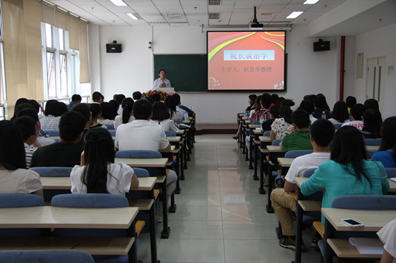 最后,赵景华院长为新生进行“院长谈治学”专题讲座。赵景华教授从自身求学之路谈起,回顾了自己学术研究的几个关键时点,阐述了多年来治学的经验和体会,举例讲解了他本科与研究生阶段的求学方法,重点强调了“高、深、比、实、戒”的治学理念,生动的诠释了如何心怀一颗责任心做好学问,教会了同学们只有了解了如何做人、如何做事、如何与人相处以及认真学习研究方法,才能够更好的做学问。最后赵院长深情的提出“贡献可以有大小,但都是正能量,希望你们做大气、有正气的人”。