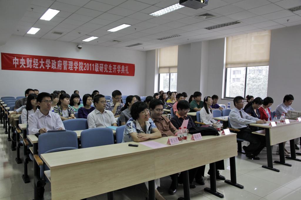 9月8日上午,学院在中财大厦三层通2教室举行了2011级研究生开学典礼。学院副院长邢华副教授,党总支副书记包英娟老师,行政管理系主任施青军教授、公共事业管理系主任徐焕东教授,硕士生导师栗玉香研究员,学院主管研究生工作的院长助理王红梅副教授出席。包括行政管理专业、教育经济与管理专业硕士研究生、全日制公共管理硕士(MPA)、博士研究生在内的58名2011级新生参加。典礼由MPA办公室主任于鹏老师主持。