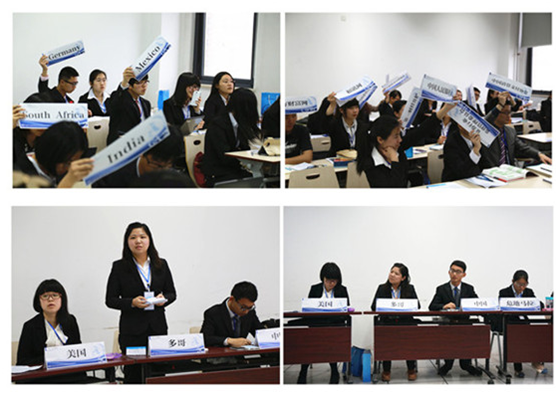 4月19日、20日,召开了模拟联合国大会各委员会会议。各参会代表分别就乌克兰问题、中国互联网金融监管问题、跨国金融犯罪、全球环境治理问题在联合国安全理事会、中国互联网金融专业委员会、联合国环境计划署四个会场展开激烈讨论,每一个身着正装的代表们都竭力表明各自立场,为本国争取最大利益,致力于提升自身国家影响力。在为期两天的三场会议中,各位代表们在紧张的协商和谈判中,不断深化对问题的理解,积极主动探求会议中所产生问题的解决途径。