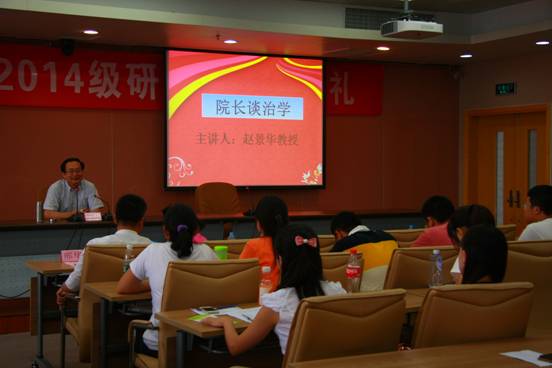 12日下午,学院在学术会堂706举行了2014级研究生开学典礼及“院长谈治学”专题讲座。学院院长、书记及学院全体硕士生导师悉数出席。典礼由王红梅副院长主持。典礼上,院长对新生的到来表示了衷心的祝贺和热烈的欢迎,他详细介绍了学院的历史沿革和发展前景,热情洋溢的致辞使同学们深刻感受到了学院团结和谐、充满友爱的氛围。2012级博士研究生段丽娜、2013级硕士研究生刘潇钺在发言中与新生们分享了自己的学习和生活经验,从过来人的角度为同学们的未来规划和学习提出了自己的建议。2014级新生张卓力则在发言中指出了重拾书本给自己生活带来的巨大改变,表达了对未来研究生生活的无比期待。