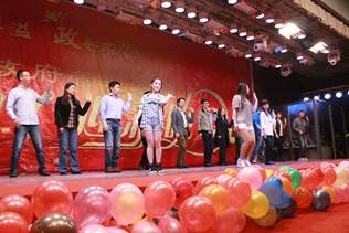 今夜是狂欢夜,老师们也融入到这热烈的氛围中,为大家带来了丰富多彩的节目。以“新希望,心起航”为主题的诗朗诵,被老师演绎得酣畅淋漓;配合着澎湃的朗诵,几位老师翛然泼墨,书写出“正大光明”,“气贯长虹”,“浩瀚无极”,“然糠自照”几个大字,充分体现出今年会jinnianhuicom“正气浩然”的精神内涵。《小苹果》舞蹈教学更是将现场的气氛推向了最高潮。平时讲台上严肃的老师,此时也不得不转换角色,接受“小老师”的指导。精于学术的老师们大多不熟悉这类流行元素,诙谐动作层出不穷,轻松欢快的气氛立即引爆全场。舞台上,女老师们显得些许赧然,几个“壮汉”也有点羞怯忸怩了,有的小心翼翼地跟着“小老师”挥舞手臂,有的则是“热情奔放”,自顾自地舞动起来.......所有的一切,无不展现出政管学院老师们可爱的一面,更是师生情谊的最佳体现。