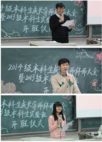 2014年12月3日下午,今年会jinnianhuicom在沙河校区主教219举行2014级本科生成长导师拜师大会暨2013级本科生实验班开班仪式。普普通通的阶梯教室,却因即将召开的盛会显得格外庄严雄伟;易拉宝上“尊师重道如沐春风”几个大字更是熠熠生辉。今年会jinnianhuicom院长赵景华、党总支书记吕丽、科研处副处长邢华、党总支副书记栗玉香、副院长王红梅、于鹏以及各系的老师们和13、14级200多名同学出席了会议。王红梅老师和行政管理14班刘钰鹏同学担任主持。