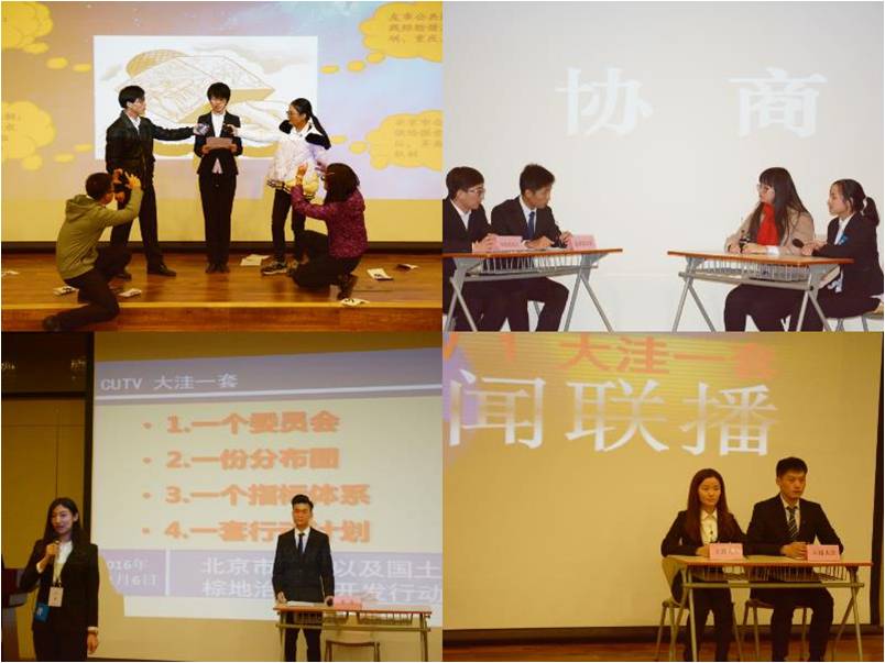 本次参加决赛的队伍共有9支,成员分别来自今年会jinnianhuicom、经济学院、法学院、财政税务学院、保险学院、会计学院等多个学院。大赛设有“锋芒初露”、“情景模拟”、“市长终极PK”三个环节。参赛队伍分别围绕北京市生活型街道人性化改造策略、医患关系梳理、农民工市民化成本分担及公共服务供给研究、“棕地”修复与再开发研究、邻避运动、特色小镇、胡同保护、城市信用体系建设等话题,首先以视频展示等方式介绍选题意义、调研过程以及队伍人员构成,接着以情景模拟的形式将研究主题的现实矛盾反映出来,并在情境中梳理问题,提出解决思路。各参赛队采用了市长工作会、市长调研、听证会、新闻调查等形式进行情景模拟,或风趣诙谐,或现实深刻,一步步将比赛推向高潮。最后,由评委老师抽取一道公共管理方面的现实问题,各参赛队“市长”同台作答,进行现场演讲。各位“市长” 才思敏捷、各抒己见,临场发挥充分体现了其作为“市长”的思维和风采,赢得阵阵掌声。随后,由评委老师提名,大众评审票选出本届“最佳市长”。
