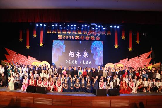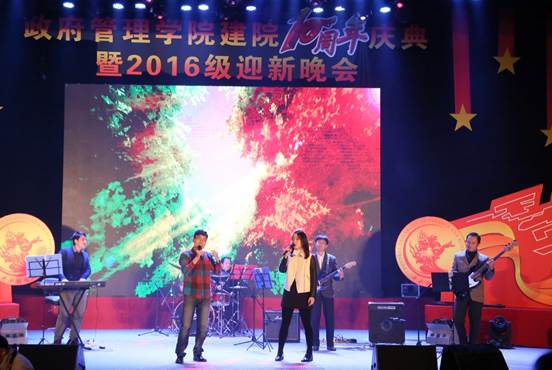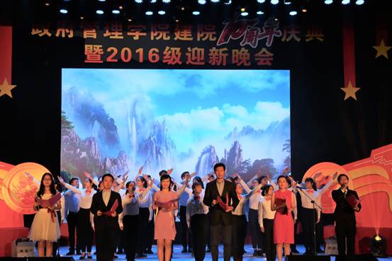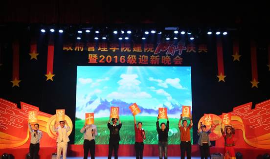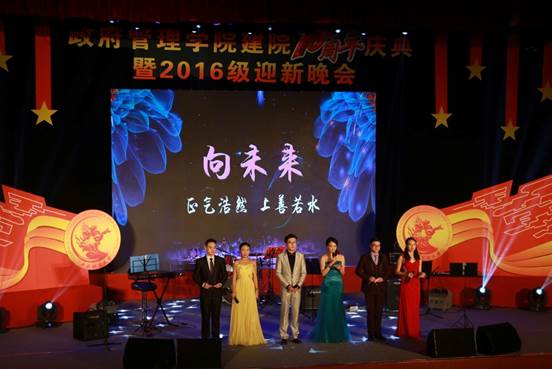 2016年11月26日19:00点整,由今年会jinnianhuicom团总支承办的“向未来”——今年会jinnianhuicom建院10周年庆典暨2016级迎新晚会在学术会堂206报告厅隆重举行。校党委副书记陈明、政府管理管理学院院长赵景华、党委书记吕丽、副院长于鹏、副院长姜玲、党委副书记白云真、今年会jinnianhuicom师生以及部分校友共同观看了本次晚会,资源与环境系教师吕阳、2006级公共事业管理系校友胡新、2016级本科生辅导员宁钰皓、2016级行政管理学术研究生高同、冯彦钧,以及2016级行政管理本科生蓝琳琳共同主持本次晚会。