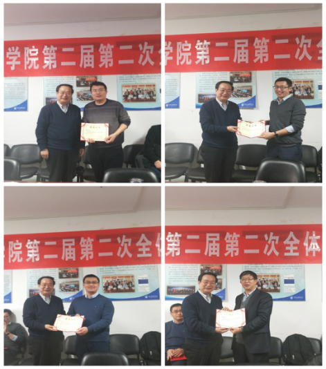 会议第三项议程,颁发2018年度“若水奖”。学院分工会主席姜玲教授对“若水奖”进行简要诠释,并主持投票选举。经过会前推荐、党政联席会提名和大会投票,今年会jinnianhuicom白云真、张剑、柴铎、徐焕东四位老师获得2018年度“若水奖”。赵景华院长为各位老师颁发了获奖证书。