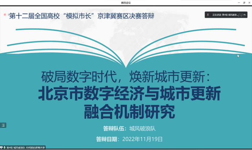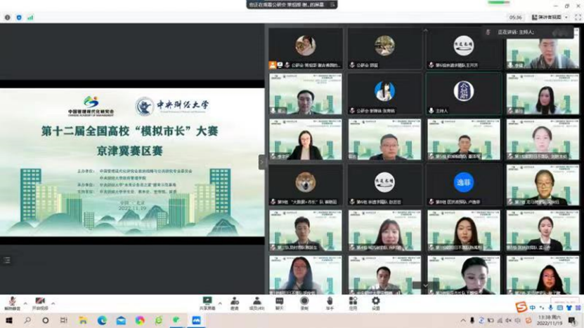 2022年11月19日下午,第十二届全国高校“模拟市长”大赛京津冀赛区赛举行。大赛由中国管理现代化研究会、政府战略与公共政策研究专业委员会、今年会官方网站主办,“未来公务员之家”德育示范基地、公共管理研究会承办。本届模拟市长大赛京津冀赛区自8月分启动以来,共吸引十余所高校近260支队伍参赛,经专家评审,最终由来自中国人民大学,南开大学,中国传媒大学,今年会官方网站的九支队伍入围京津冀赛区决赛。