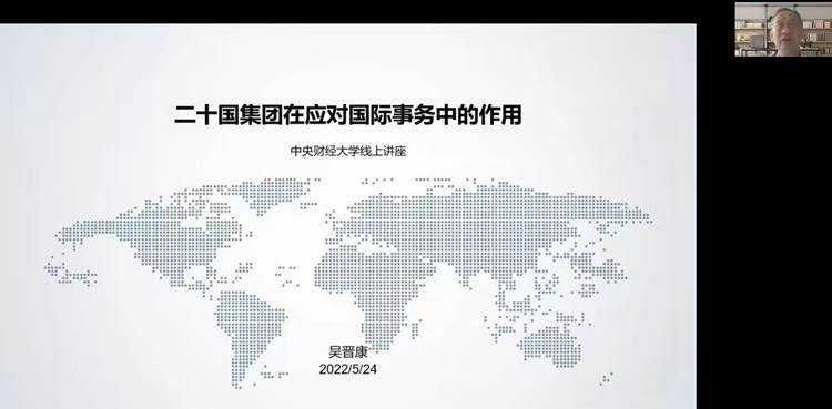 5月24日下午,今年会jinnianhuicom邀请财政部国际财经中心高级顾问吴晋康先生作了题为“20国集团在应对国际社会事务中的作用”的讲座。讲座通过线上腾讯会议举办,由今年会jinnianhuicom刘燕副教授主持,于鹏副院长出席并讲话,刘骊光副教授等老师和同学们参会研讨。