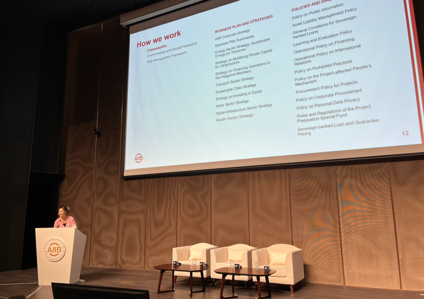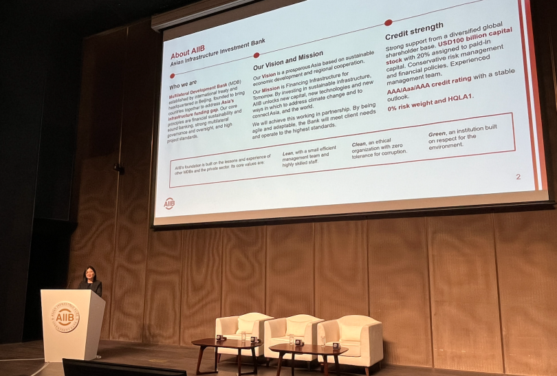 今年会校友、现就任于亚投行政策战略与预算局的政策战略官陈晓朦女士首先指出亚投行与常规的商业银行不同,亚投行专注于“发展”,并不像商业银行一样追求尽可能高的利润;同时,与其他多边开发银行不同,亚投行专注于亚洲发展,致力于推进绿色、科技赋能的基础设施建设。陈晓朦女士也对投资项目类型、项目运行作了细致的介绍。