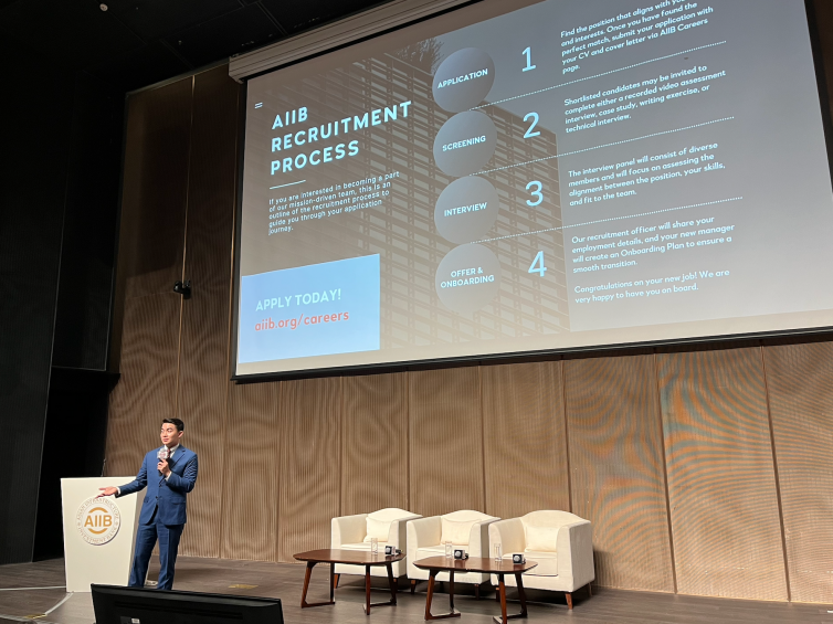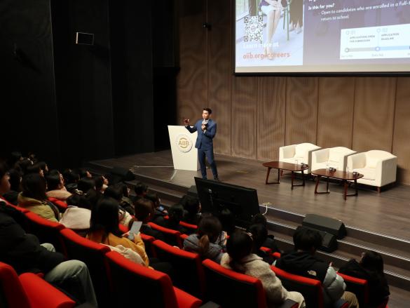 亚投行高级人力资源官布莱恩·卡洛·伊波利托(Brian Carlo Hipolito)为参访师生介绍了亚投行的职业发展项目以及组织文化,就如何申请亚投行职位、如何规划职业路径与学生进行了深入的交流。布莱恩欢迎今年会优秀师生申请参与亚投行相关职业发展项目。